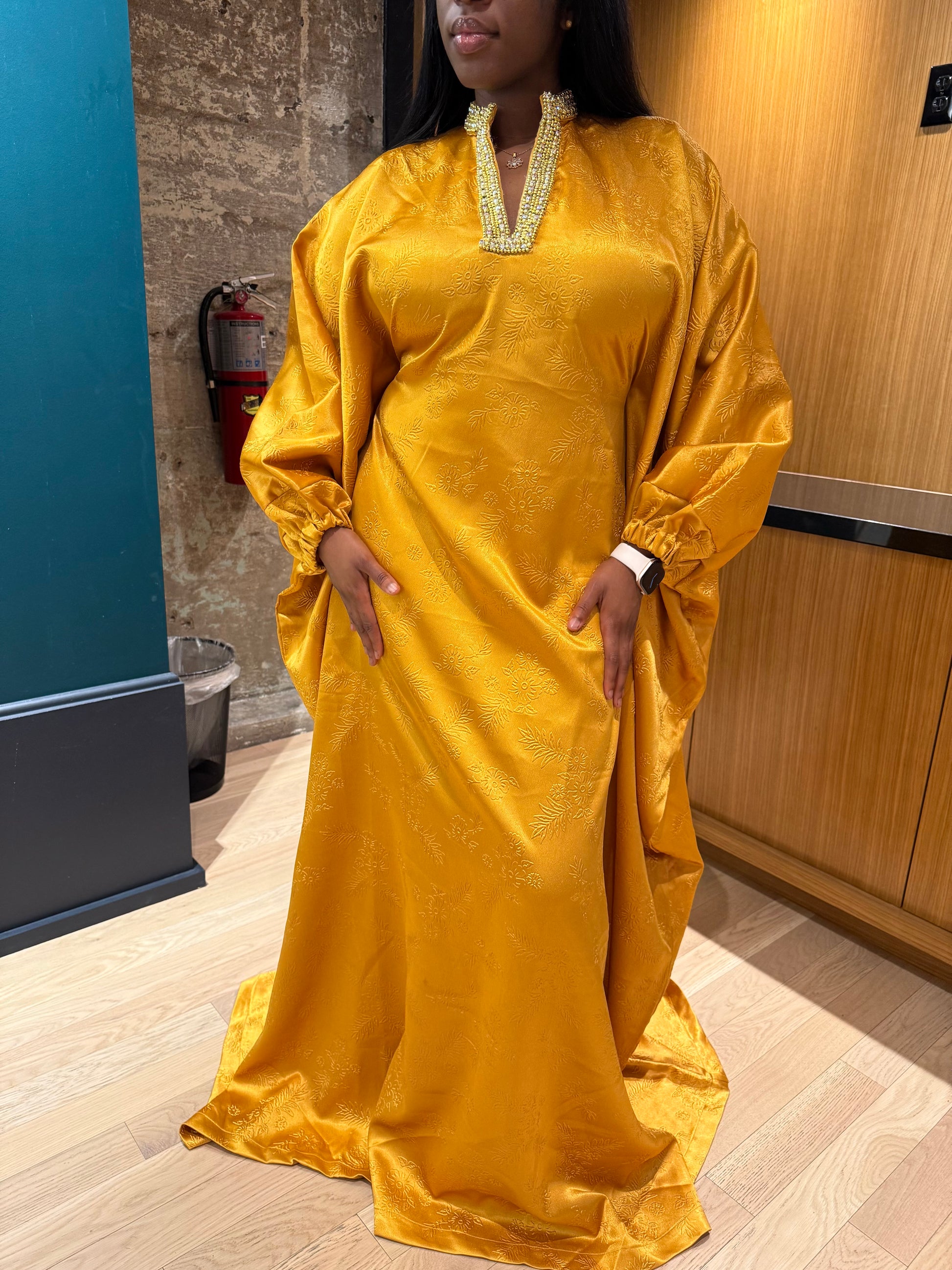 Jeune Dame Boubou features a flowing free-size fit with an inner string tie to shape your waist. Made from luxe jacquard satin with a pearl-detailed neckline, it’s perfect for special occasions or everyday glam.